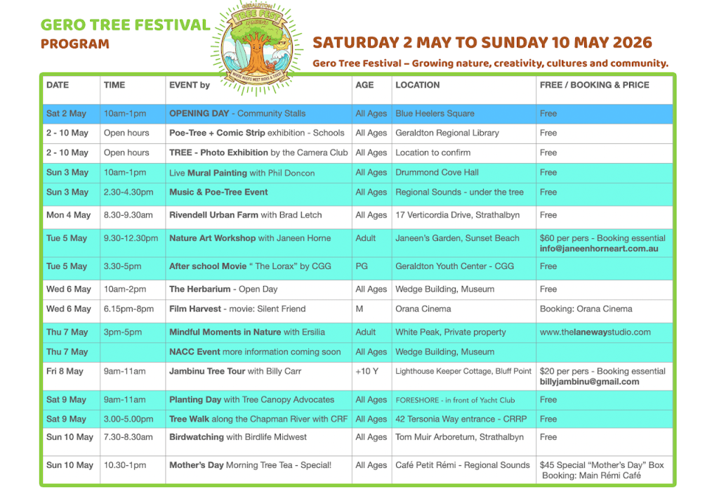 Geraldton is set to come alive with the very first Gero Tree Festival, a vibrant nine-day celebration of community, creativity, cultures and trees with events organised every day from Saturday 2 May to Sunday 10 May 2026.